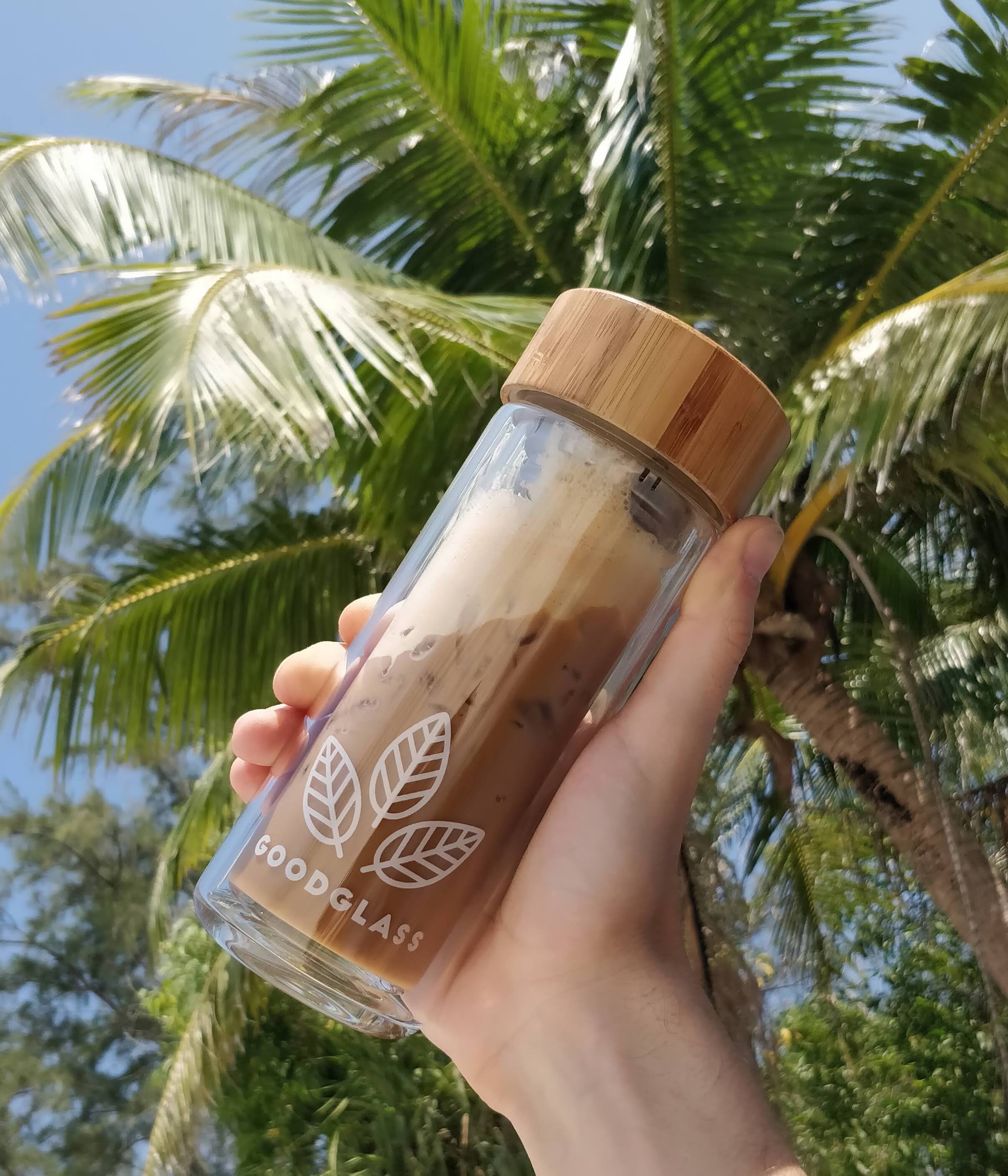3. We snap the strainer into the GoodGlass, pour in boiling water, and let it steep for about 8-10 minutes. ⁠
